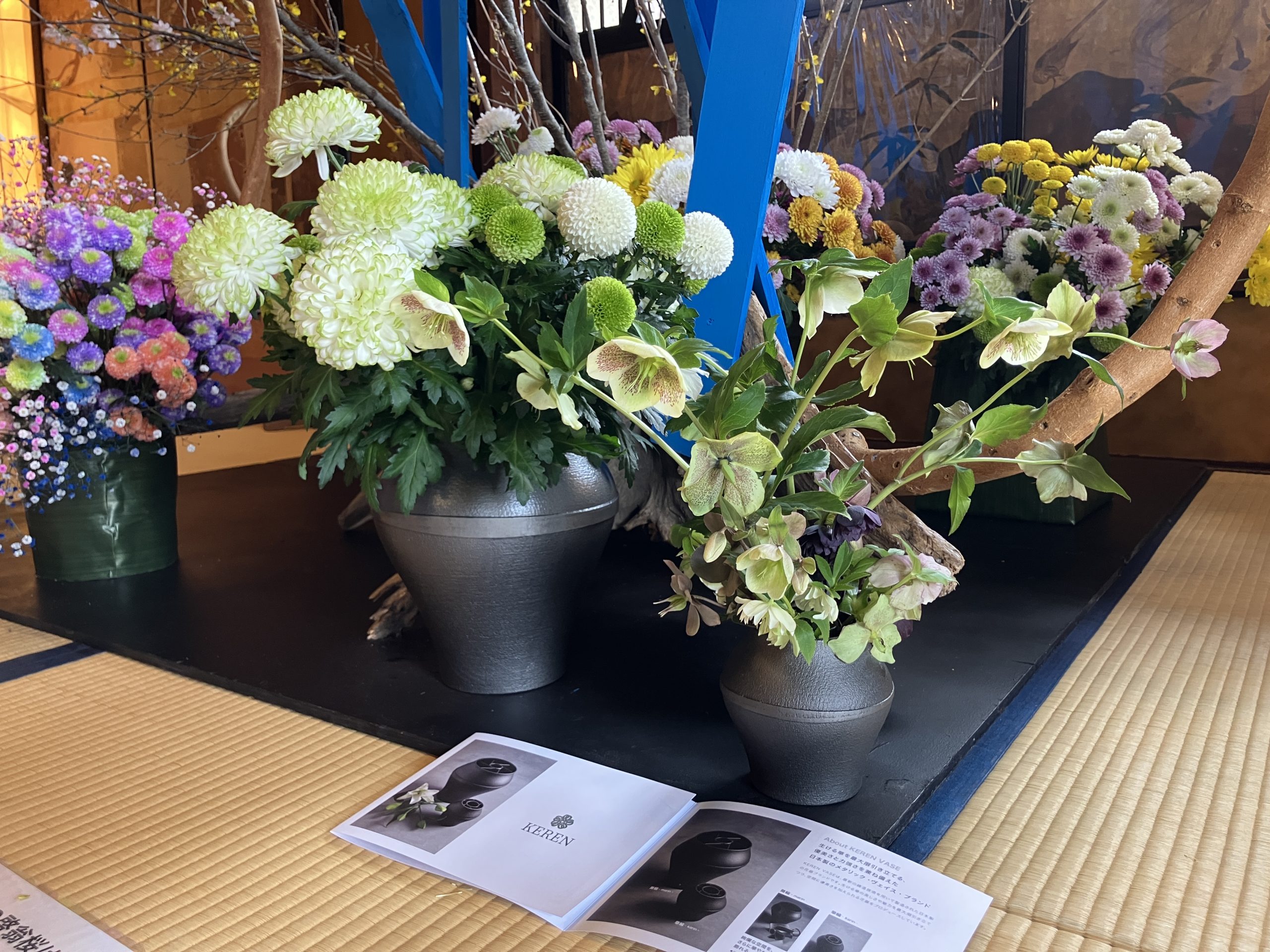本展は、華道歴40年を超える假屋崎氏による展示であり、歴史的建築である蔵春閣を舞台に華やかで独創的ないけばな作品が展示してあります。空間全体を活かした演出により、伝統と現代美が融合した芸術体験を楽しむことができます。そのような特別な舞台において、KERENが作品の一部として採用されたことを大変光栄に感じております。