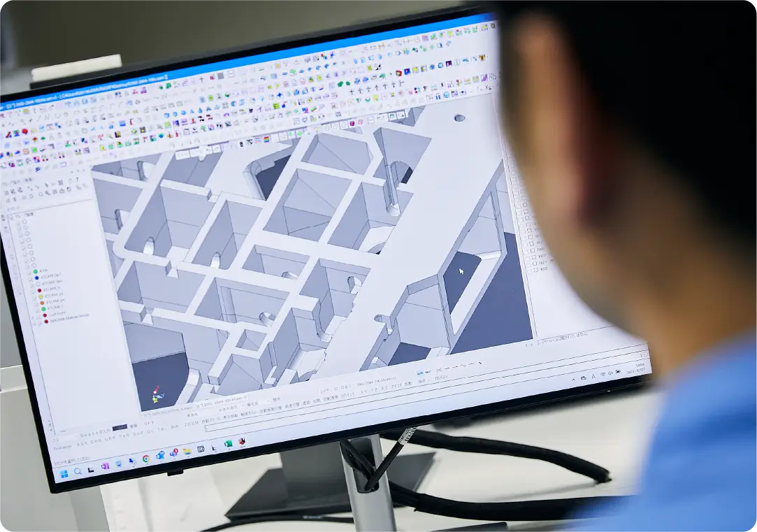 図面や3次元データをもとに、CAD/CAMというツールを使って製品を実際に作るためのデータや製造指示書を作成します。